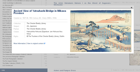The organisation is a Europeana Network partner and was established under the auspices of the Royal Irish Academy to manage and co-ordinate the increasingly complex e-resources created in the arts and humanities Their Europeana API implementation enriches search results on their website. It pulls in related Europeana content based on a mix of keywords in the item’s metadata. Related content is then presented by subject, creator and location (based on the design of the Europeana portal).