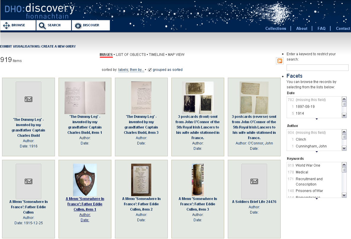 The Digital Humanities Observatory has extended its API implementation to harvest the Irish related Europeana 1914-1918 stories relating to Ireland, making them available on their portal and displaying them in their experimental ‘Exhibit Visualizations’.